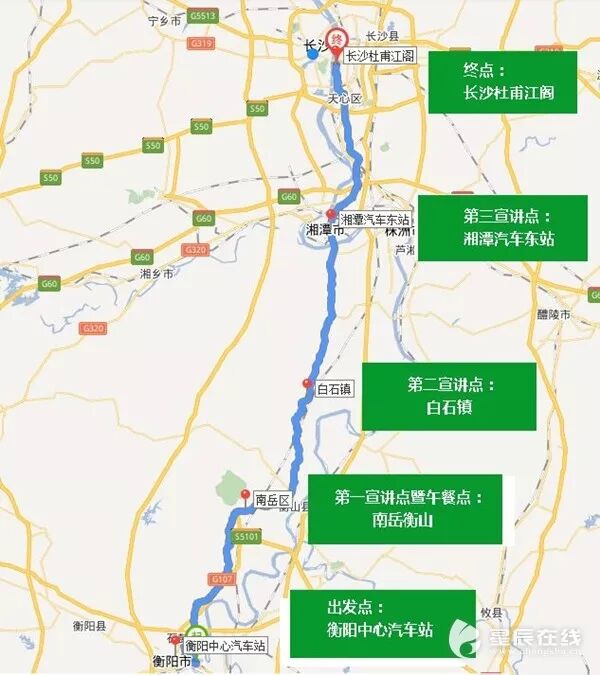 此次骑行出发点为衡阳中心汽车站,终点为长沙杜甫江阁,沿途三个宣讲点分别是南岳衡山、白石镇、湘潭汽车东站,宣讲以“做文明骑行者”为主题,内容以演讲比赛时文稿内容为基础,让骑士以自身的模范行动带动身边的人,把文明风尚带到城市的每一个角落。